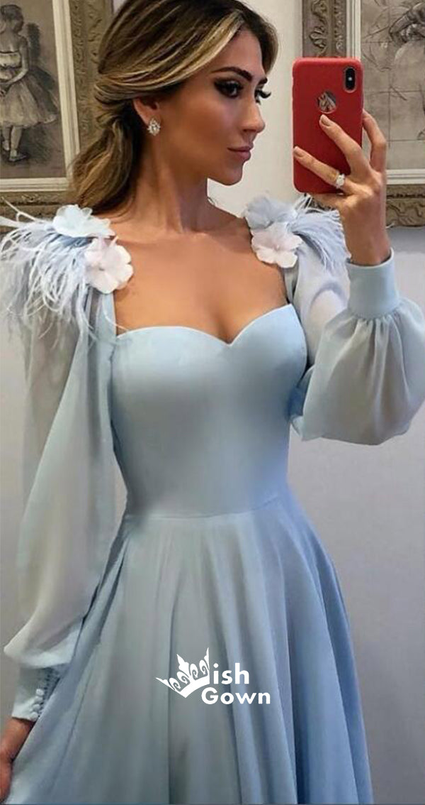 Blue Long Sleeves Sweetheart A Line Long Prom Dresses, SG163