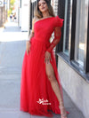 Chic Red Tulle One Shoulder A-line Side Split Long Prom Dresses , WGP124