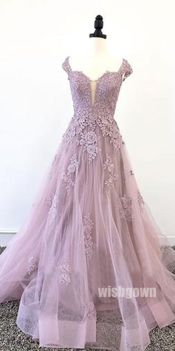 Elegant Cap Sleeve Applique Tulle Long Prom Dresses PG1185