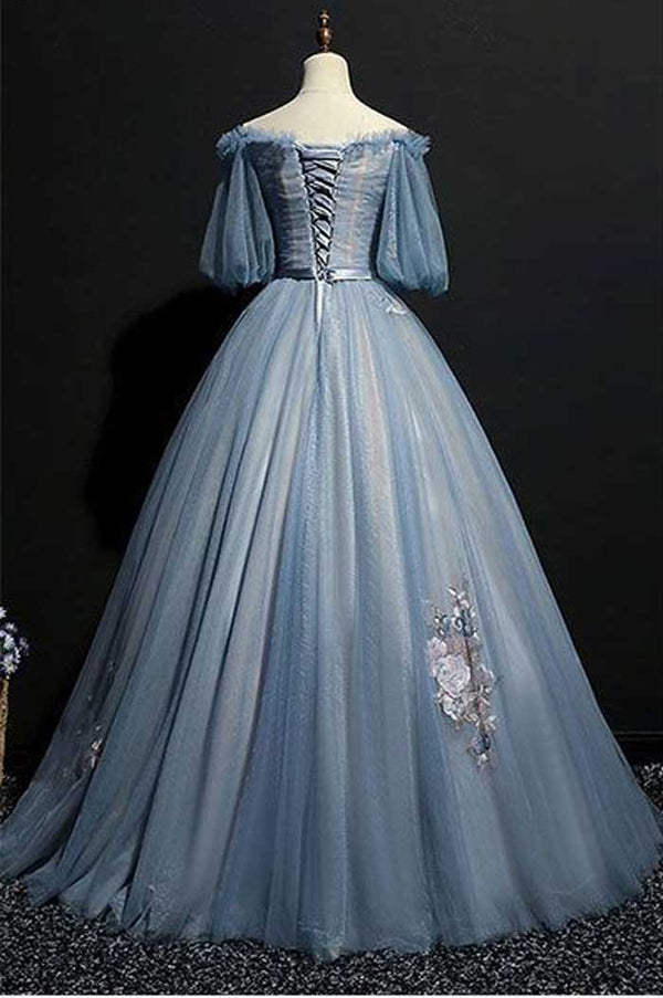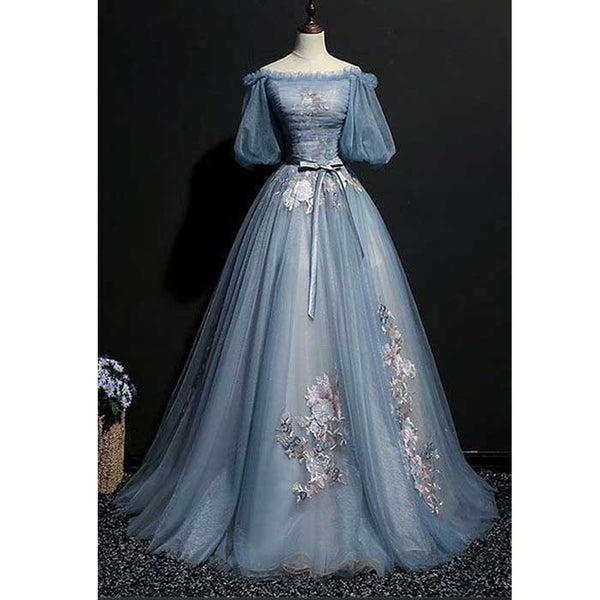 Half Sleeves Lace Up Back Off the Shoulder Long Prom Dresses, SG107