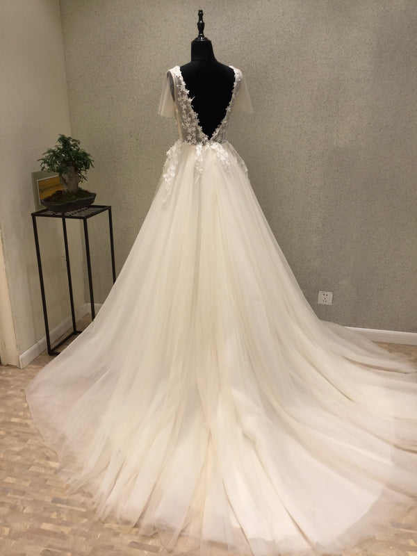 Affordable Short Sleeves V Back Elegant Long Wedding Dresses, WG1230