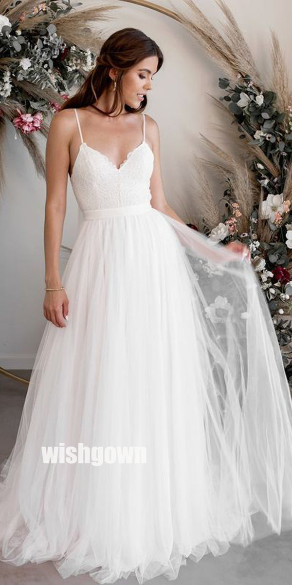 Simple V-neck Spaghetti Strap Tulle Long Wedding Dress WDH046