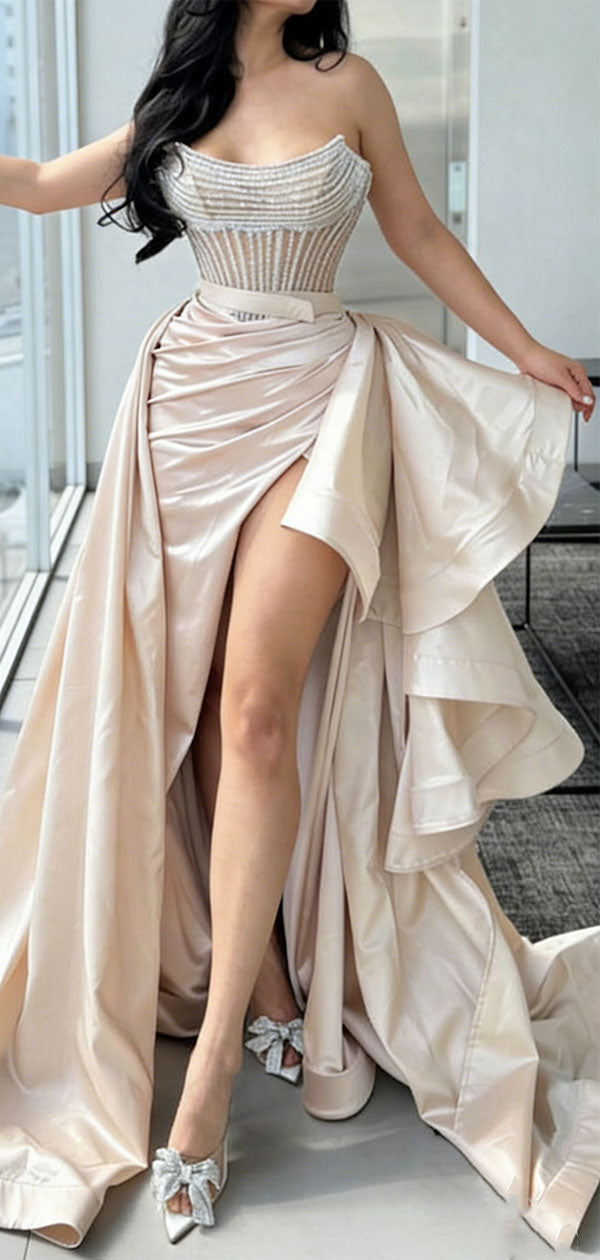 Fancy Pearl Beaded Corset Prom Dress Strapless High Slit Satin Ruched Drape Ball Gown,WGP2075