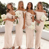 Modern Champagne Off the Shoulder Satin Bridesmaid Gown with Unique Side Tie Sleeves,WGM475