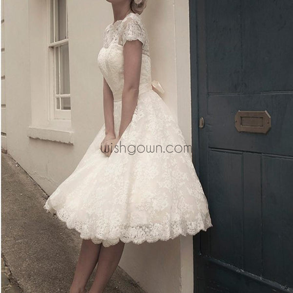 The short sleeve lace knee-length homecoming dresses are fully lined, 8 bones in the bodice, chest pad in the bust, lace up back or zipper back are all available.