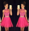 Sexy Two Pieces Beaded Hot Pink Halter homecoming prom dresses