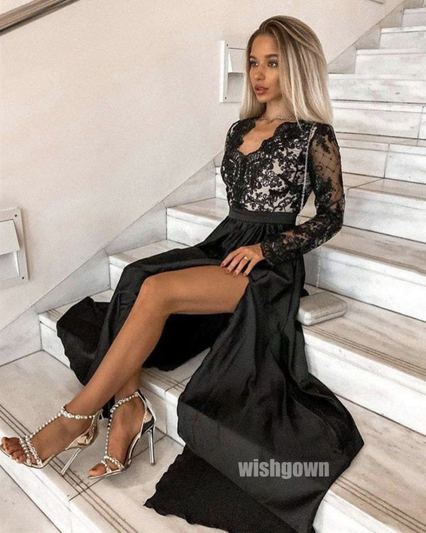 Sexy V-neck Black Lace Long Sleeves Long Prom Dresses, PG1250