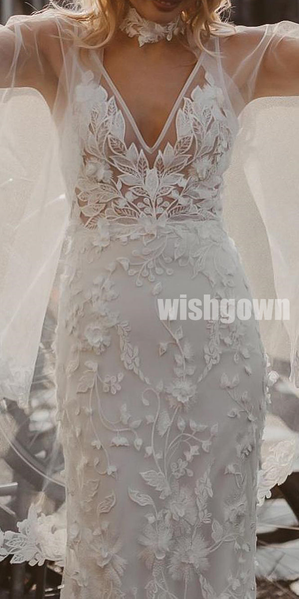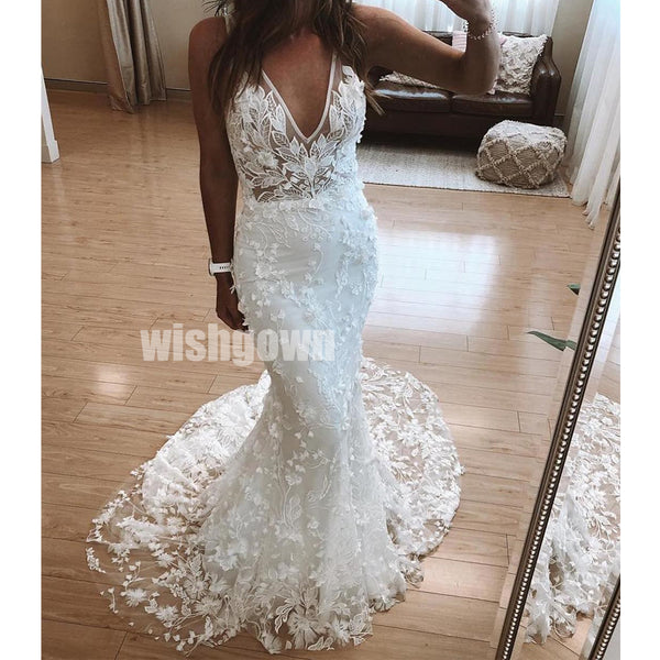 V-neck Mermaid Lace Applique Long Wedding Dresses YH1116
