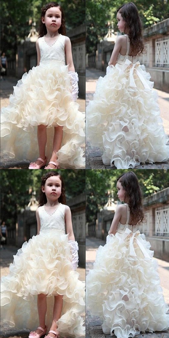 V-neck Hi-low Ivory Flower Girl Dresses, Cute Cheap Tutu Dresses, FG01