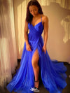 Elegant Blue Spaghetti-Strap A-Line Side Slit Long Prom Dress Ideas, E
