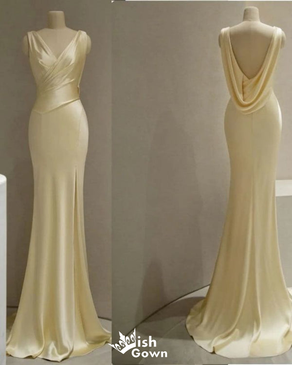 Elegant Light Yellow V Neck Mermaid Long Party Dress Prom Dresses, WGP970