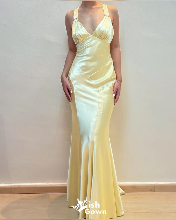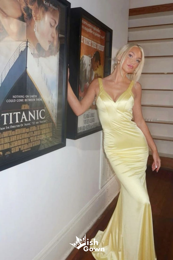 Sexy Mermaid Pale Yellow V Neck Satin Long Prom Dresses ,WGP1069
