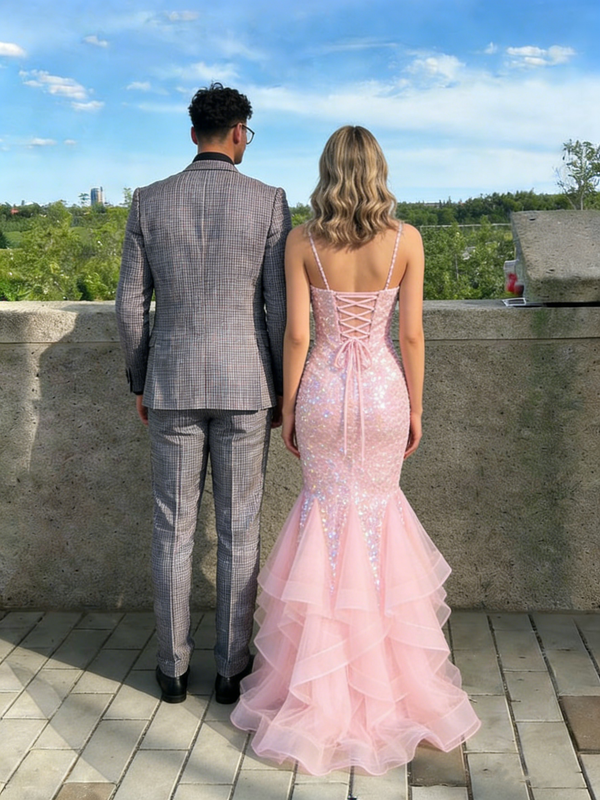 Sexy Pink Sequin Mermaid Prom Dress with Ruffled Tulle Bottom and V-Neck Sparkly Gown,WGP2099