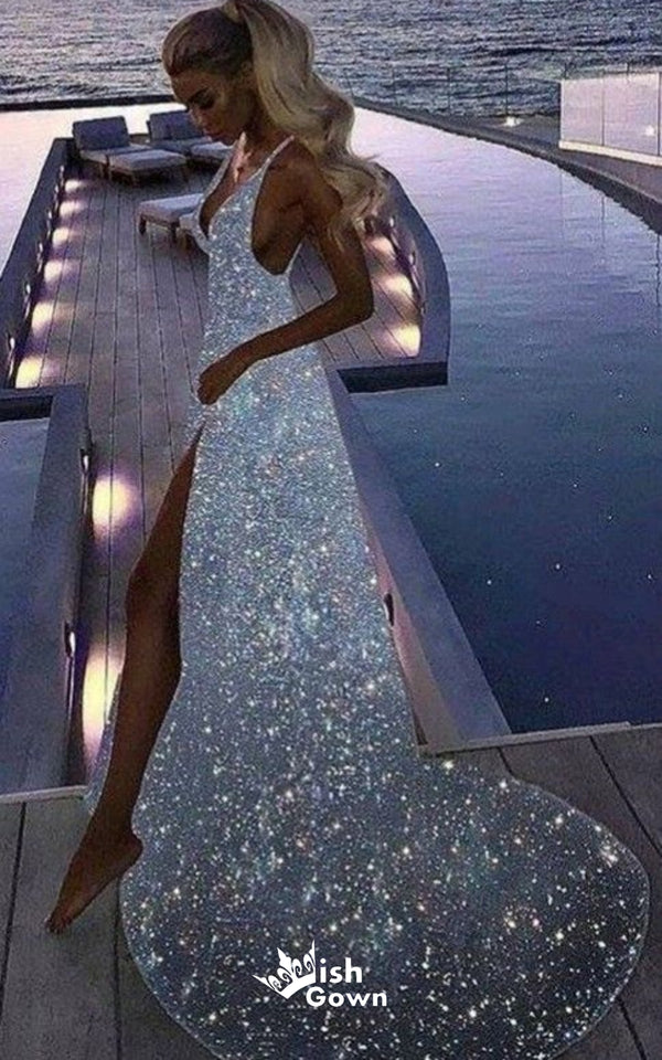 Shiny Silver V Neck Side Slit A-line Lace up Back Party Dress Long Prom Dresses to Impress , WGP964