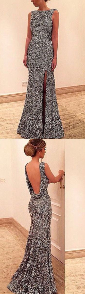 Side Slit Silver Sequin Backless Sexy New Arrival Evening Long Prom Dresses Online, PD0142