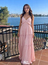Fancy Pink Ruffled Empire Waist Prom Dress Sleeveless V-Neck Tiered Chiffon Maxi Gown,WGP2173