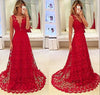 Red Sexy Deep V Neck Lace Elegant Long Prom Dresses, WG996