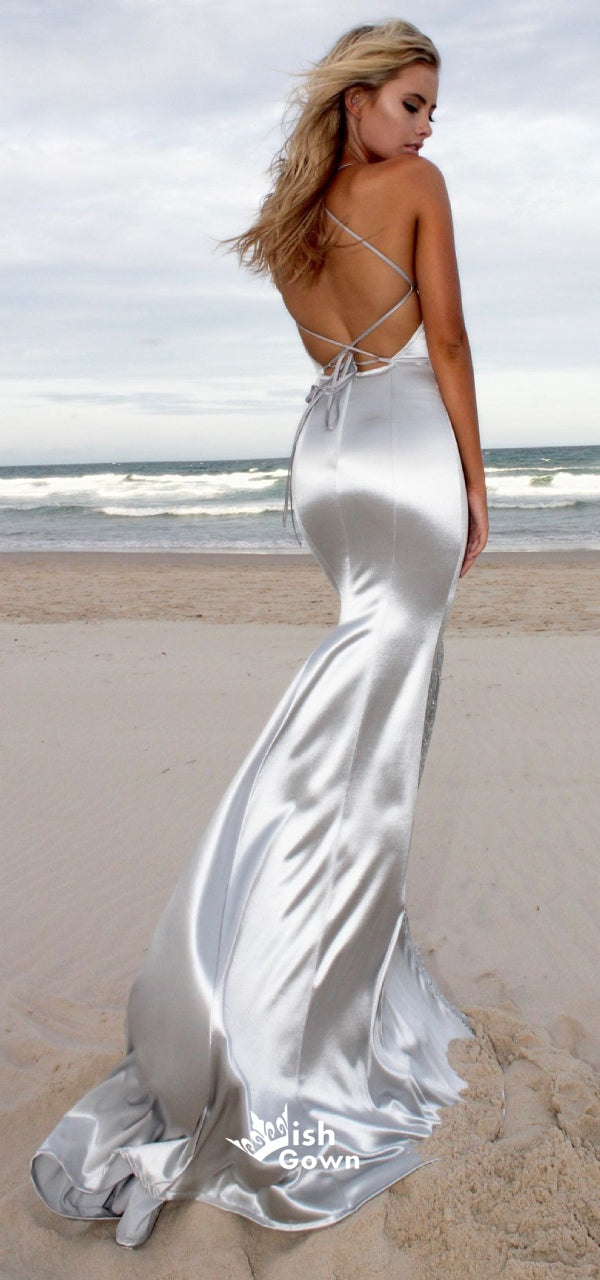 Silver Halter Open Back Mermaid Sexy Cheap Long Evening Prom Dresses, WG1018