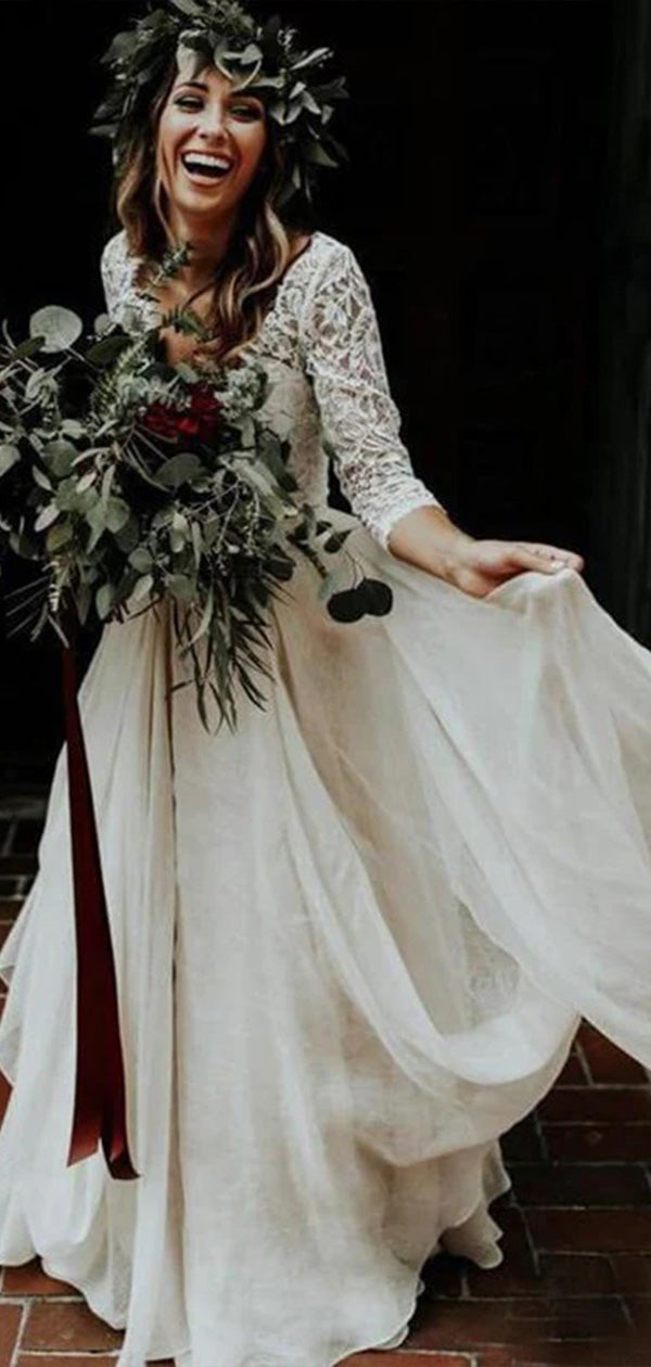 Elegant Tulle V Neck 3/4 Sleeve Applique Popular Bridal Long Wedding D