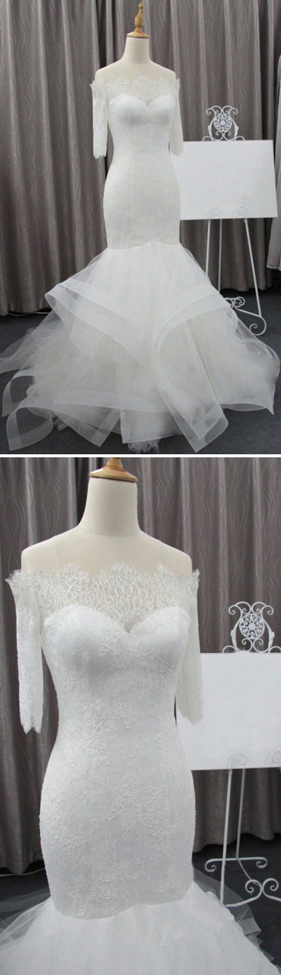 Vantage Off Shoulder Half Sleeve Lace Sexy Mermaid Wedding Party Dresses, WD0075