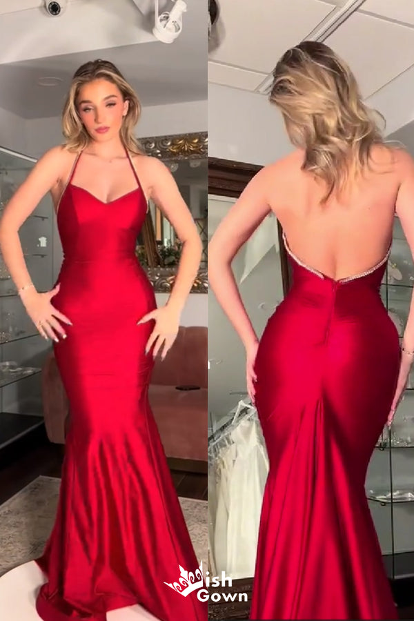 Gorgeous Red Halter Mermaid Beaded Long Prom Dresses ,WGP1055