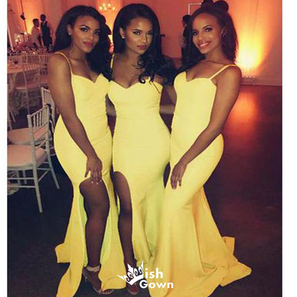 Sexy Yellow Mermaid V Neck Spaghetti Straps Popular Cheap Maxi Long Wedding Guest Bridesmaid Dresses,WGM211
