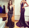 Black Sequin Shinning Deep V Neck Halter Mermaid Long Prom Dresses, WG585