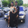 Black Sexy Open Back Side Split White Applique Formal Cheap Long Prom Dresses, WG275