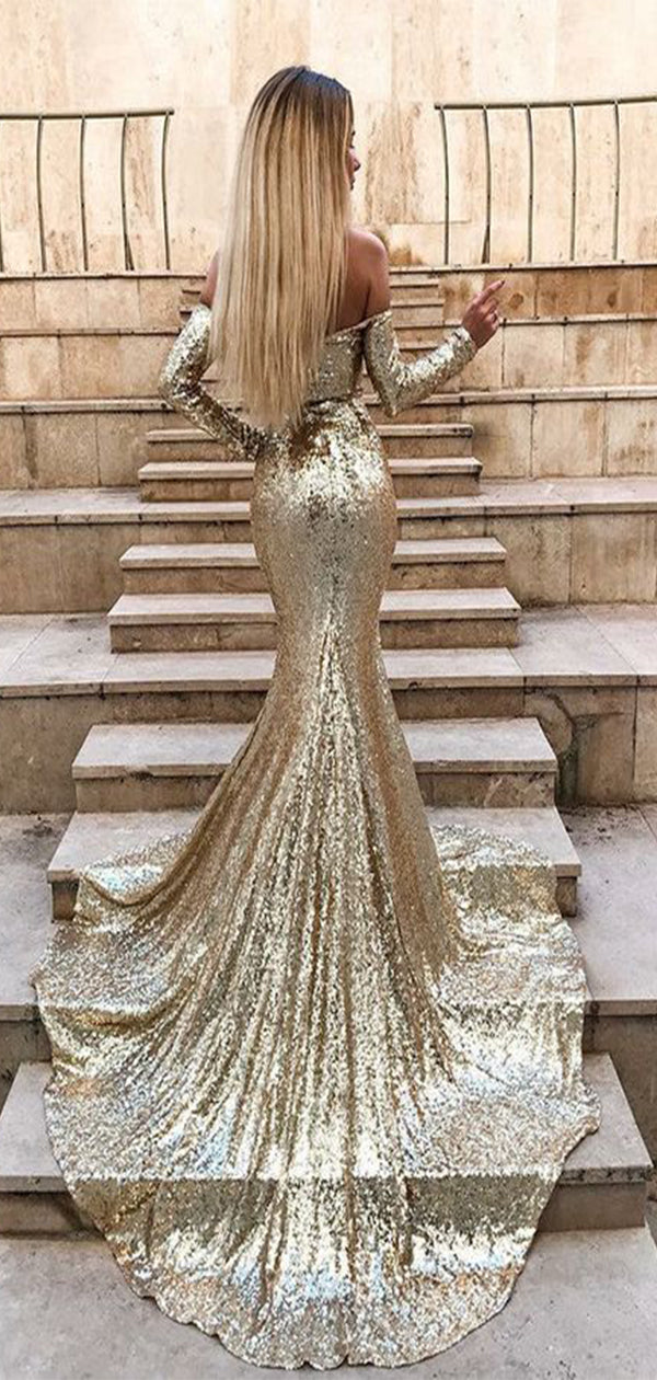 Charming Golden Mermaid Long Sleeve Popular Long Evening Dresses, Formal Dresses, Birthday Party, WGP557