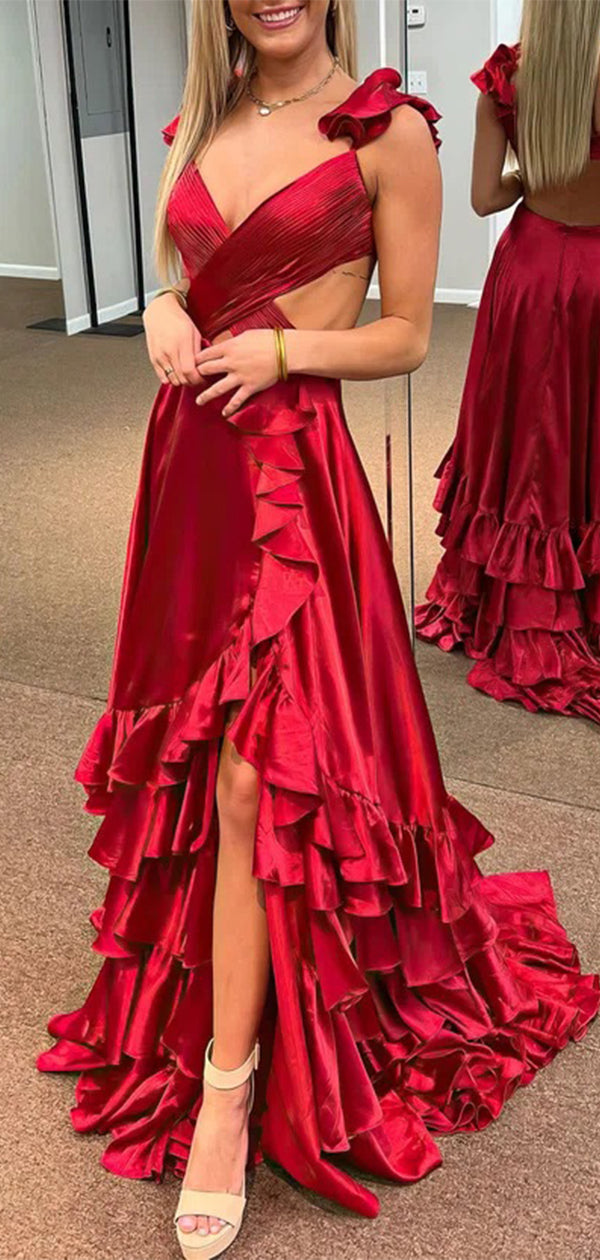 Sexy Red A-Line V-neck Side Slit Popular Long Evening Dresses with Trailing, Formal Dresses, Birthday Party, WGP568