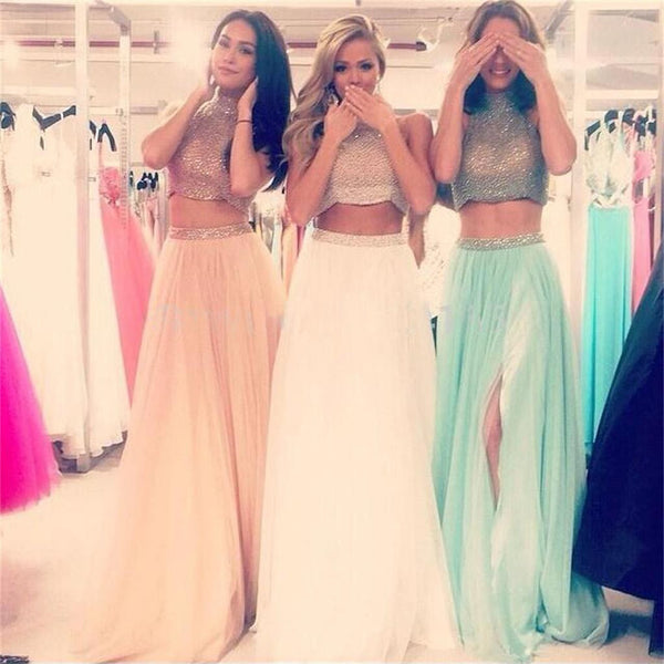 High Neck Side Slit Two Pieces A-Line Party Evening Cheap Long Prom Dress, PD0124