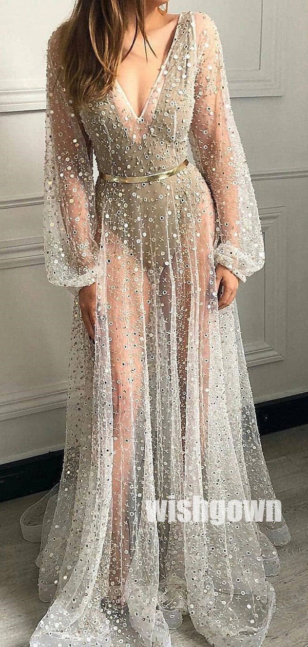 Long Sleeves V-neck See Through Long Prom Dresses PG1162