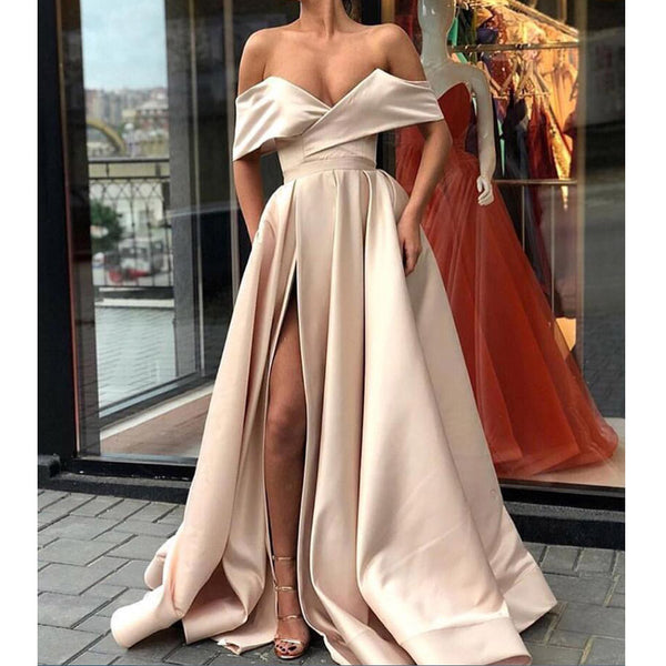 Off the Shoulder Simple A Line Cheap Side Slit Long Prom Dresses, SG158