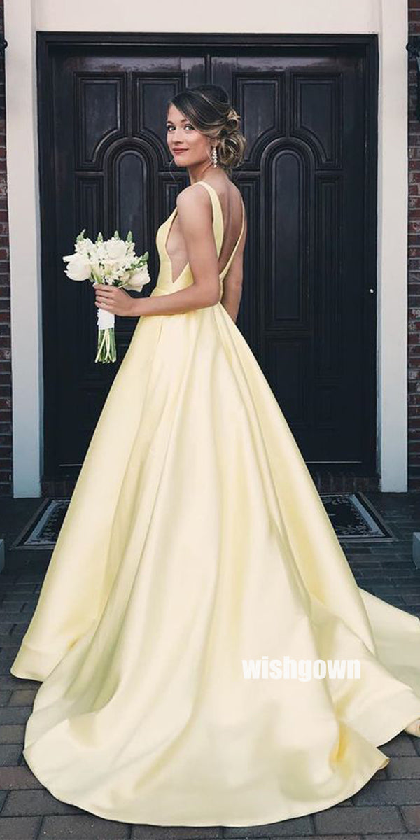 Simple Yellow V-neck Stain Long Prom Dresses PG1232