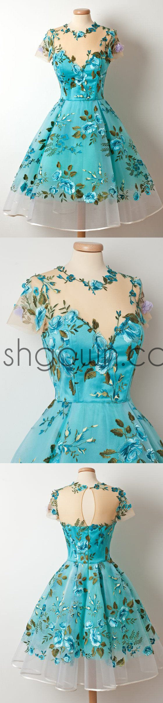 Short Sleeves Unique Applique Blue Short Homecoming Dresses, WG804