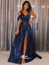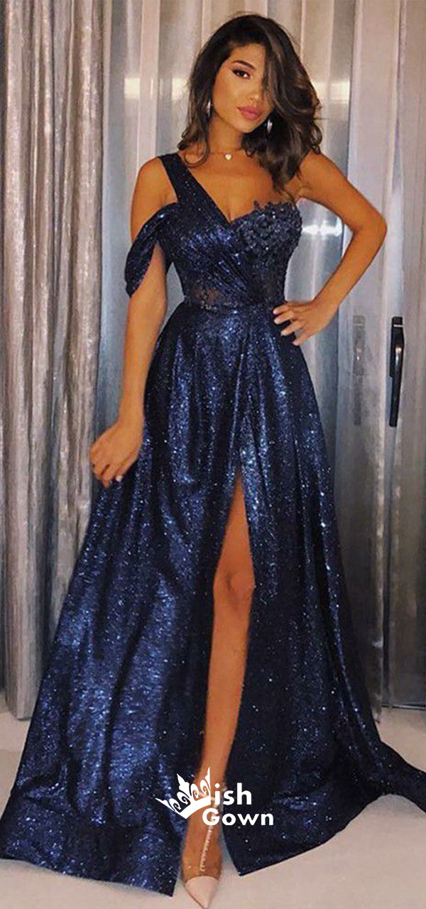 Navy Blue One Shoulder Shiny Sequins Split A-Line Evening Gowns Prom Dresses, WGP192