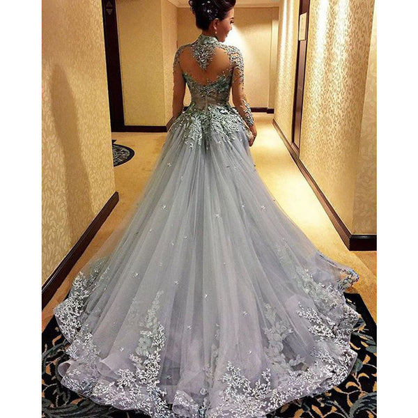 Charming High Neck Long Sleeve See Through Back Grey Affordable Long Prom Dress Gown, WG266