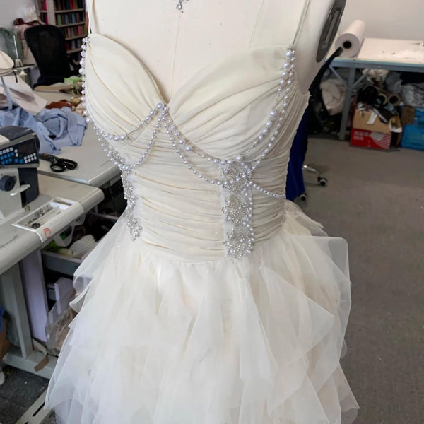 It's beautiful, I loved it... The details on the chest are so pretty, I ordered it in white and it's not much different from ivory. I'm a size s and I ordered a size 2. It had a little loose waist. But it can be adjusted and if it's a little long in the front, but I'll also adjust it according to my shoes that I'm going to wear that day! But it's beautiful, but I recommend my expectations to make the purchase of your dress.