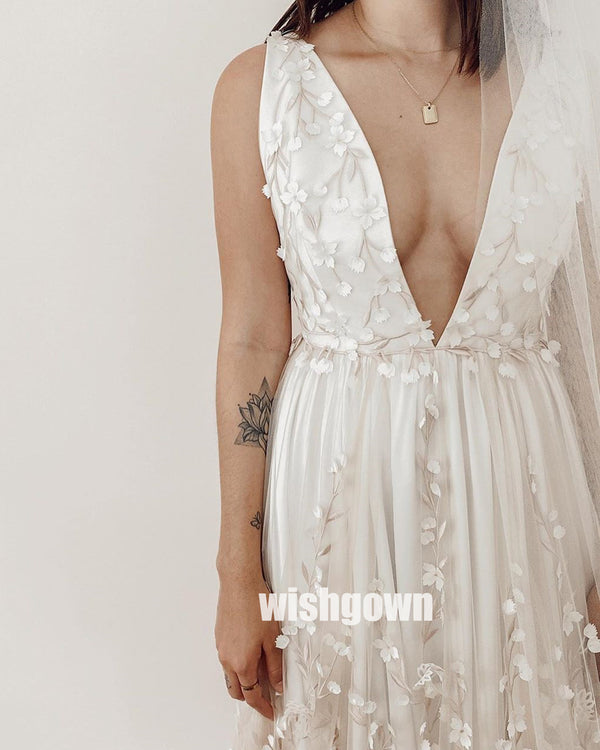 Floral Prints Deep V-neck Wedding Dresses Tulle Bridal Dresses WDH034