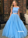 Charming Two Pieces Blue Sabrina Tulle Long Prom Dresses PG1226