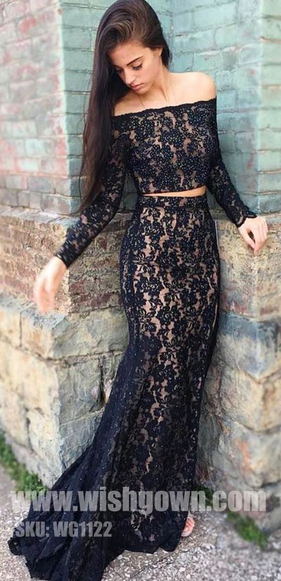 Two Pieces Off the Shoulder Long Sleeves Mermaid Black Long Prom Dresses, WG1122