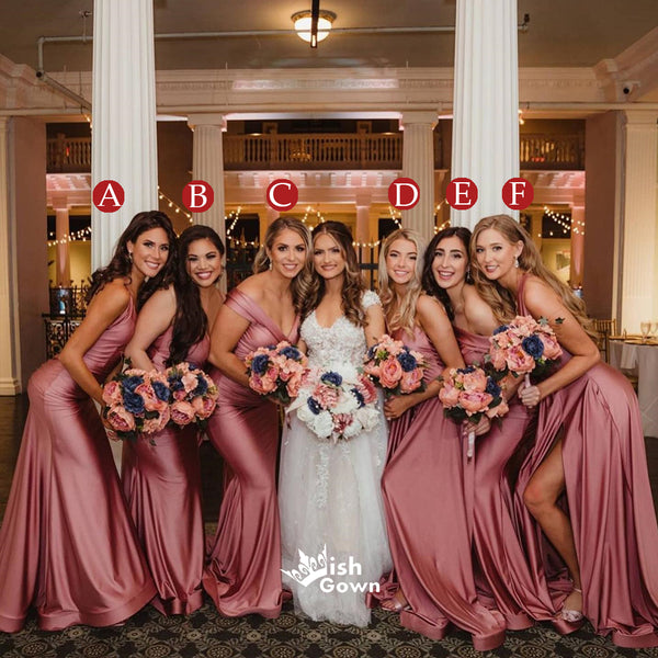 Mismatched Blush Pink Pleats Slits Mermaid Soft Satin Long Bridesmaid Dresses, WGM118