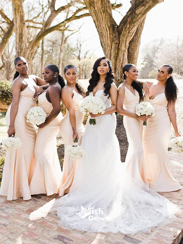 Simple Spaghetti Strap Mermaid Soft Satin Floor Length Bridesmaid Dresses, WGM059
