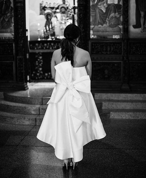 Pink White Bowknot Strapless A-line Short Front Long Back Wedding Party Bridesmaid Dresses, WGM029