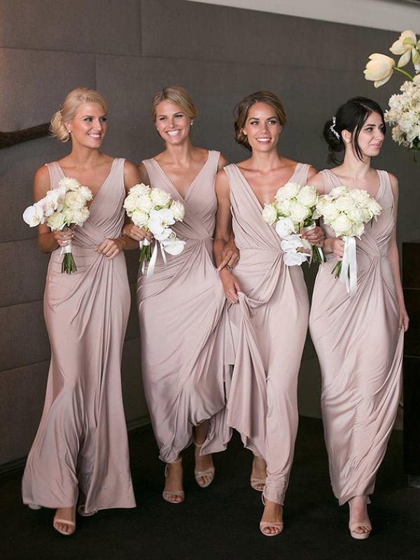 Simple Dusty V-neck Sleeveless Sheath Pink Floor Length Bridesmaid Dresses, WGM030