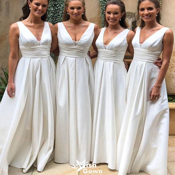 Elegant White V-Neck Spaghetti Strap A-Line Sleeveless Wedding Guest Bridesmaid Dresses,WGM404