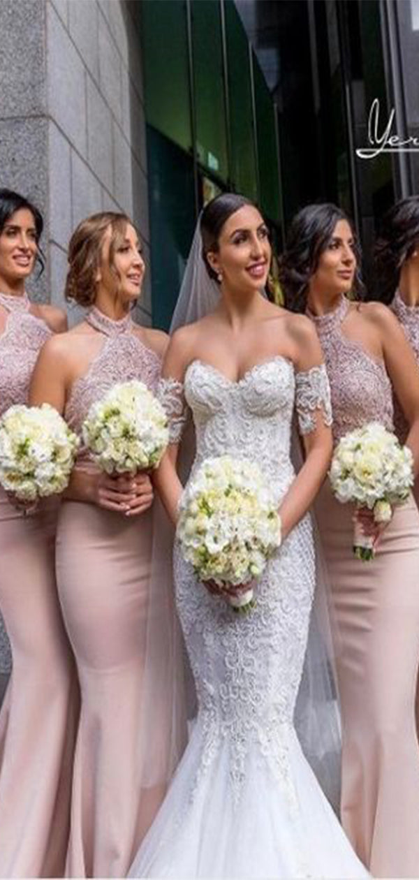 Elegant Pink Mermaid Halter Lace Sleeveless Wedding Guest Bridesmaid Dresses,WGM351