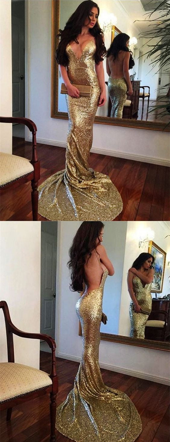 Gold Sequin V Neck Backless Sexy Mermaid Shinning Bridesmaid Prom Dress, WG721