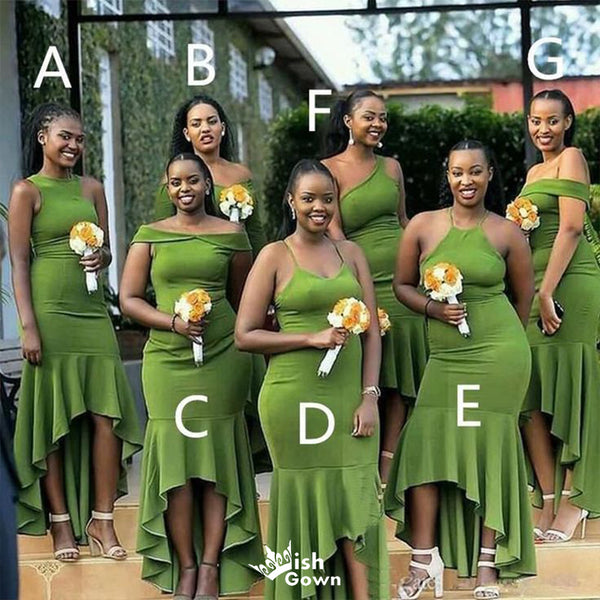 Mismatched Green Mermaid Short Front Long Back Sleeveless Popular Cheap Maxi Long Wedding Guest Bridesmaid Dresses,WGM300