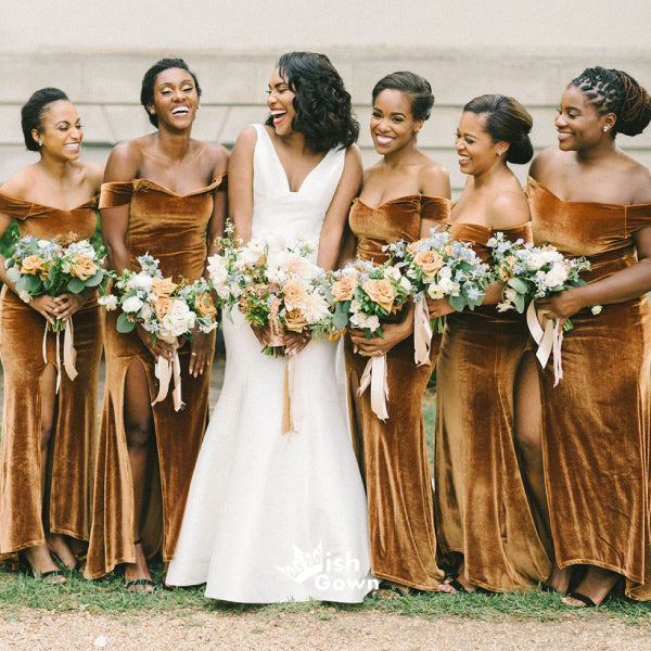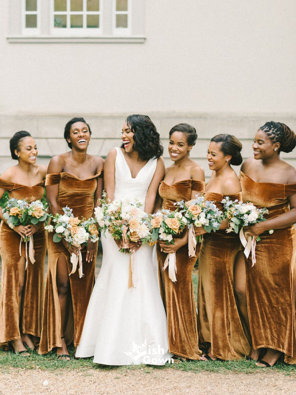 Romantic Velvet Off Shoulder Side Slits Mermaid Long Bridesmaid Dresses, WGM077